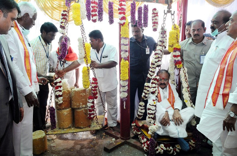 The Vice President, M. Venkaiah Naidu offering jiggery to the goddesses at the Sammakka Saralamma festival, in Medaram village, Telangana on February 02, 2018. The Deputy Chief Minister of Telangana, Kadiyam Srihari, the Minister for Endowments, Telangana, I.K. Reddy and other dignitaries are also seen.