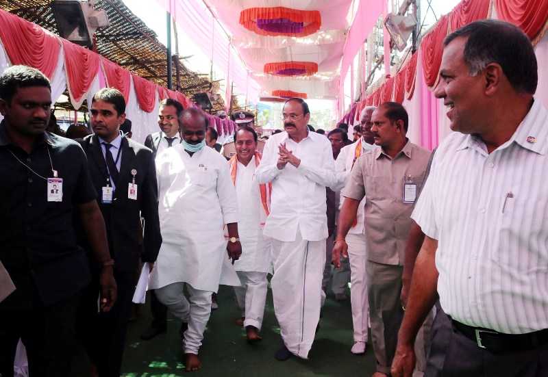 The Vice President, M. Venkaiah Naidu at the Sammakka Saralamma festival, the biggest Tribal Festival in Asia, in Medaram village, Telangana on February 02, 2018. The Deputy Chief Minister of Telangana, Kadiyam Srihari, the Minister for Endowments, Telangana, .K. Reddy and other dignitaries are also seen.