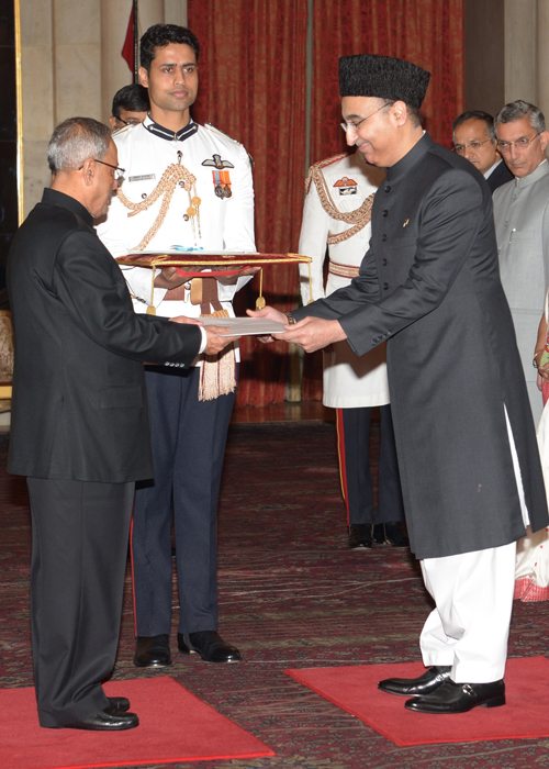 The High Commissioner-Designate of Pakistan, Mr. Abdul Basit presenting his credentials to the President, Shri Pranab Mukherjee, at Rashtrapati Bhavan, in New Delhi on April 02, 2014.