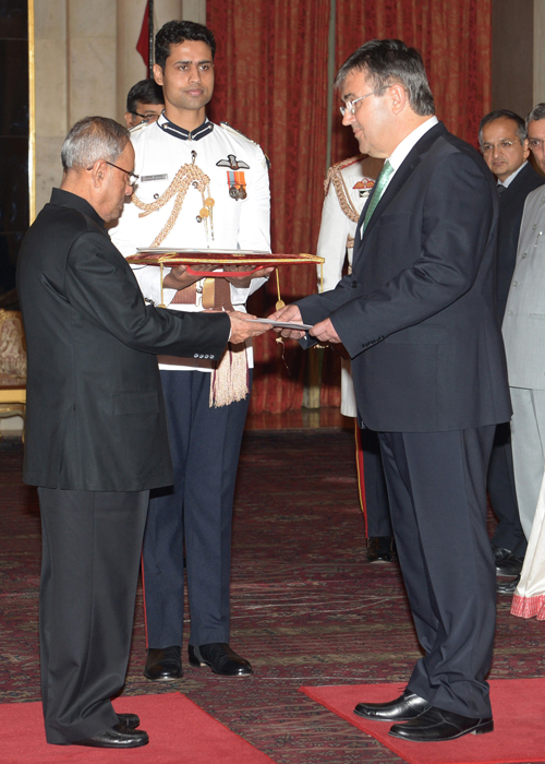 The Ambassador-Designate of Guatemala, Mr. Georges de La Roche Du Ronzet Plihal presenting his credentials to the President, Shri Pranab Mukherjee, at Rashtrapati Bhavan, in New Delhi on April 02, 2014.