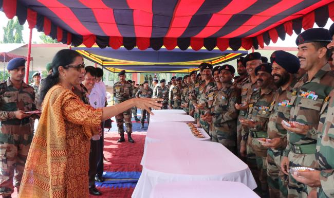 The Union Minister for Defence, Nirmala Sitharaman interacting with the officers and jawans, during her visit to the Solmara Military Station, Tezpur on October 08, 2017.