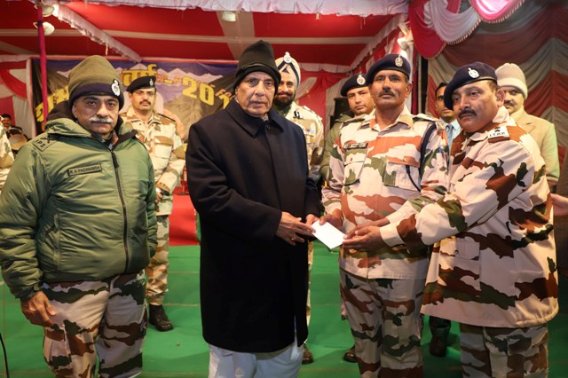 The Union Home Minister, Rajnath Singh presenting a gift cheque to ITBP personnel, during his visit to the 12th Battalion of Indo-Tibetan Border Police (ITBP), on the occasion of the New Year celebrations, at Matli, Uttarkashi, in Uttarakhand on December 31, 2017. The Director General, ITBP, R.K. Pachnanda is also seen.