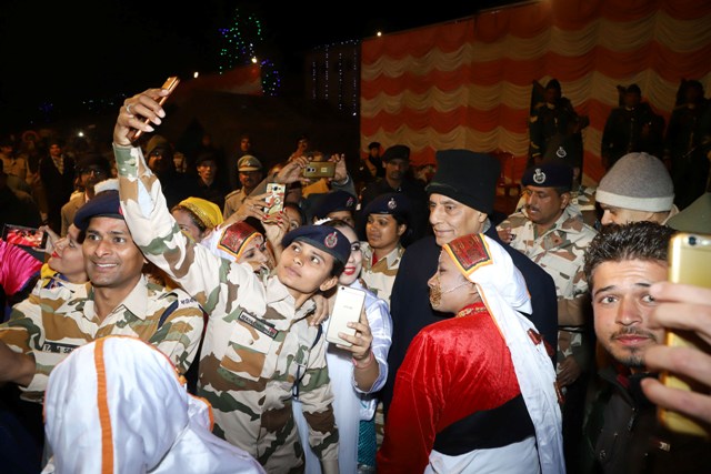 The Union Home Minister, Rajnath Singh thronged by artistes, ITBP personnel and their families, during his visit to the 12th Battalion of Indo-Tibetan Border Police (ITBP), on the occasion of the New Year celebrations, at Matli, Uttarkashi, in Uttarakhand on December 31, 2017.