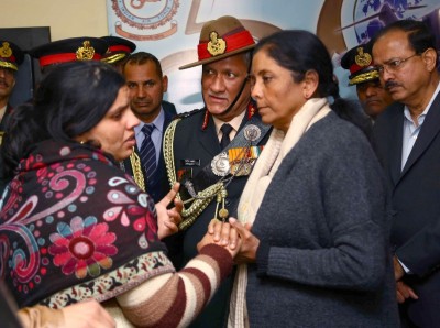 The Union Minister for Defence, Nirmala Sitharaman consoling the family member of Captain Kapil Kundu who was martyred on 04th Feb 2018 at Rajouri Sector in J&K, in Air Force Station Palam, New Delhi on February 05, 2018. The Minister of State for Defence, Dr. Subhash Ramrao Bhamre and the Chief of Army Staff, General Bipin Rawat are also seen.