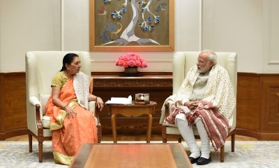 The Union Minister for Women and Child Development, Maneka Sanjay Gandhi interacting with the media at a Special Screening of the film ‘Padman’, in New Delhi on February 07, 2018. The Secretary, Ministry of Women and Child Development, Rakesh Srivastava and the Producer of the film Padman, Twinkle Khanna are also seen.