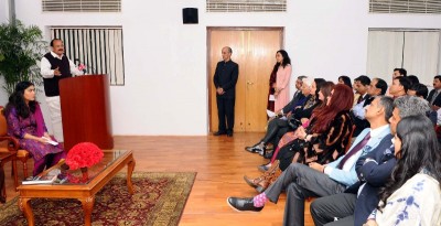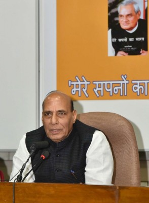 The Union Home Minister, Rajnath Singh addressing the gathering after launching of the book “Mere Sapno Ka Bharat”, a collection of best interviews of the former Prime Minister, Atal Bihari Vajpayee by the former Member of Parliament, Tarun Vijay, in New Delhi on February 08, 2018.