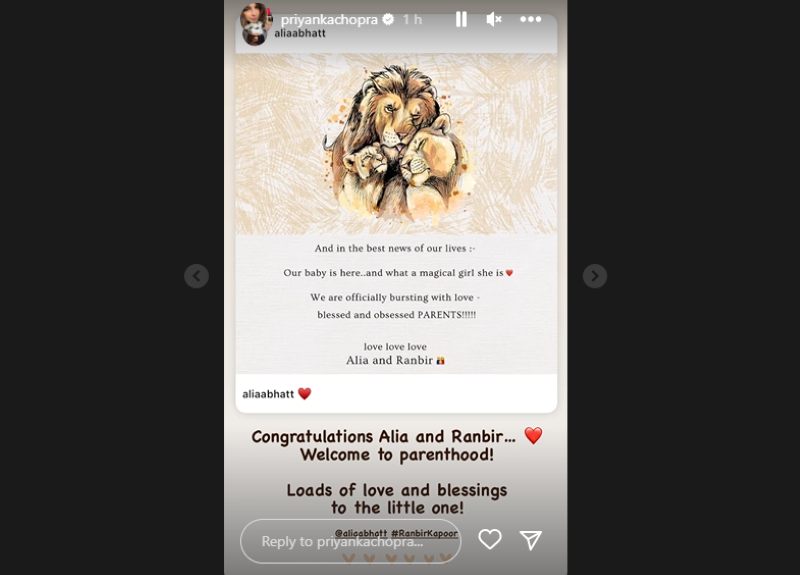 Priyanka Chopra said, "Congratulations Alia and Ranbir... Welcome to parenthood! Loads of love and blessings to the little one!"