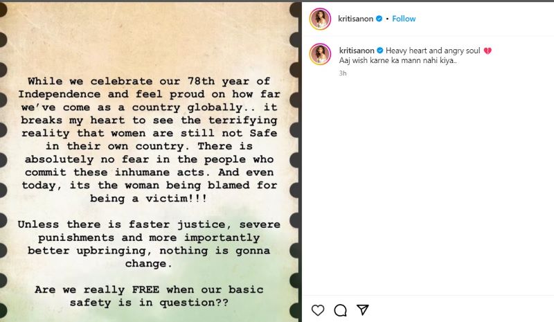Mumbai/IBNS: In her Independence Day post, Bollywood actor Kriti Sanon did not "feel like wishing" with a "heavy heart and angry soul" over the heinous rape and murder case of a 31-year-old trainee doctor in Kolkata's RG Kar Medical College and Hospital.
