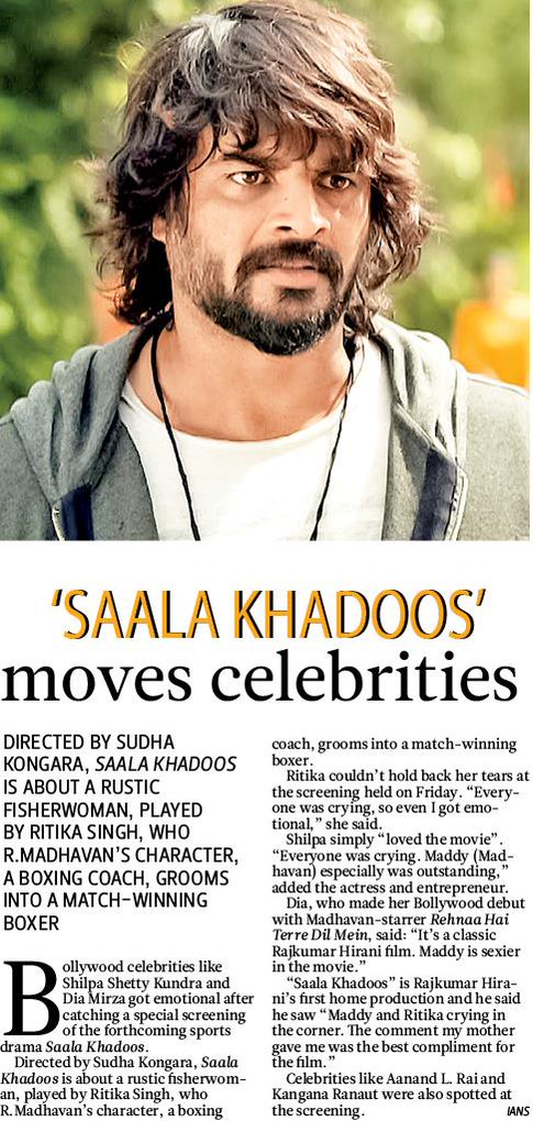 Rajkumar Hirani Films & Tricolour Films in association with UTV Motion Pictures present Saala Khadoos. The film stars R. Madhavan in lead role alongside Ritika Singh. The film written and directed by Sudha Kongara is all set to release on Jan 29.