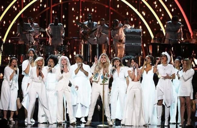 Recording artist Kesha led an all female group for a powerful performance. The group, dressed in white, sang an emotional single, Praying.
