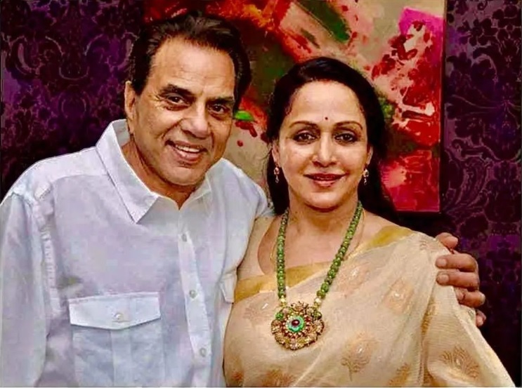 In the image, Hema Malini is looking gorgeous in a beige coloured saree, while Dharmendra looks dapper in a white shirt.