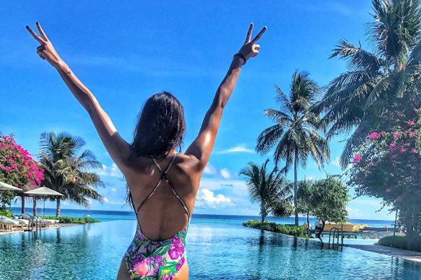 The image suggests that she is having some fun time in the sea at some unknown destination.