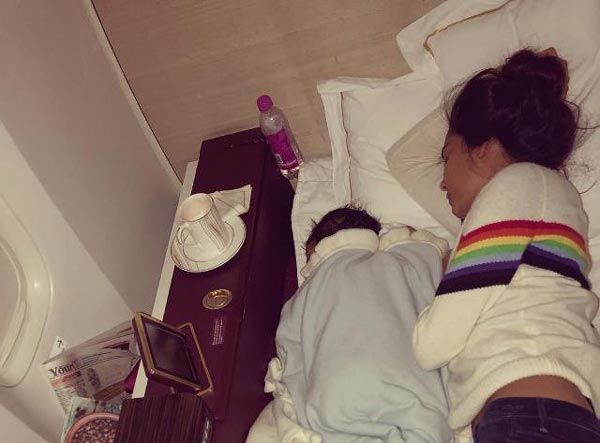 The caption of the picture reads: "Not usually into posting plush plane cabins but this â˜ï¸ was all on @jetairways ... possibly the easiest first long haul with my babe as it could have been. Thank you ðŸ™."
