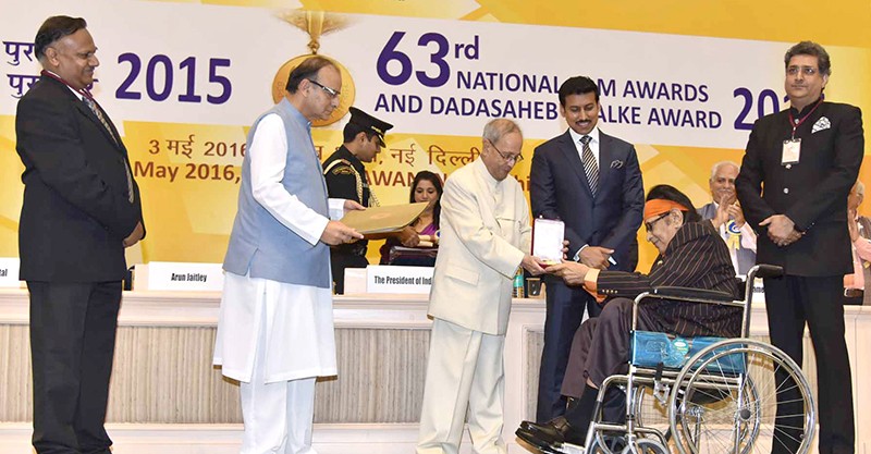 Then President of India Pranab Mukherjee presenting the Dadasaheb Phalke Award to Manoj Kumar at the 63rd National Film Awards in 2016. Photo: PIB