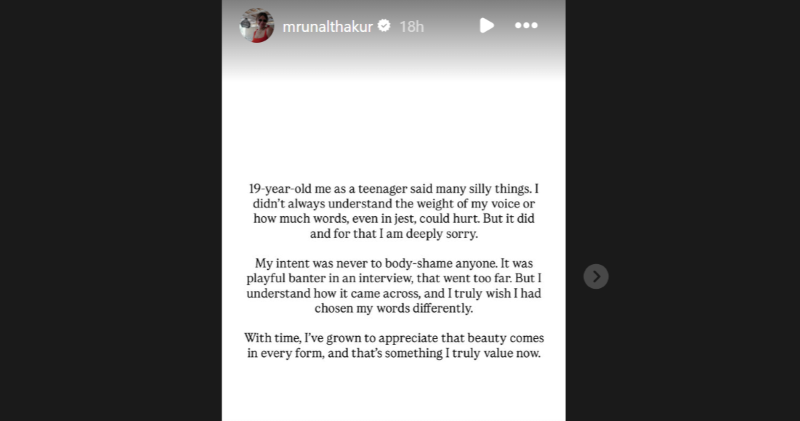 Now without taking any name, Mrunal apologised and wrote in an Instagram story, "19-year-old me as a teenager said many silly things. I didn’t always understand the weight of my voice or how much words, even in jest, could hurt. But it did and for that I am deeply sorry.