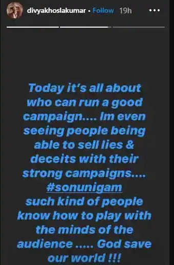 “Today it’s all about who can run a good campaign.. I'm even seeing people being able to sell lies and deceits with their strong campaigns.. #SonuNigam such kind of people know how to play with the minds of the audience.. God save our world,” she posted in her Instagram story.