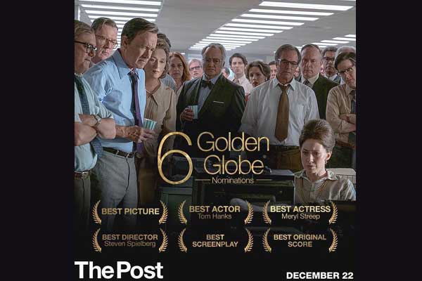 Indian film critic Taran Adarsh tweeted: "Steven Spielberg’s #ThePost bags 6 nominations at #GoldenGlobe: Best Picture, Best Actor [Tom Hanks], Best Actress [Meryl Streep], Best Director, Best Screenplay, Best Original Score... India release on 12 Jan 2018."