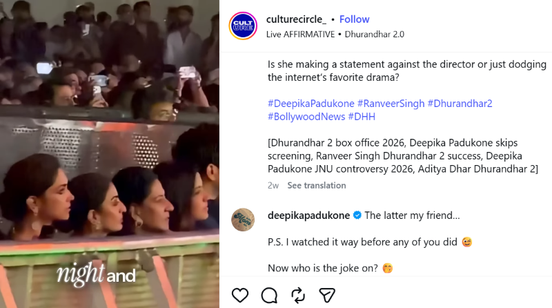 An Instagram page, Culture Circle, shared a reel questioning Deepika’s silence, noting that she skipped the film’s premiere and attended a concert instead.