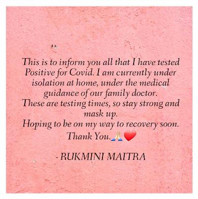Meanwhile, in an Instagram post, Rukmini Maitra shared: "This is to inform you all that I have tested positive for Covid. I am currently under isolation at home, under the medical guidance of our family doctor. These are testing time so stay strong and mask up."