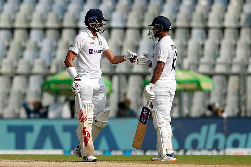 India lost back to back wickets in the morning as Kiwi spin bowler Ajaz Patel picked Wriddhiman Saha (27) and Ravichandran Ashwin (zero) in two successive balls.