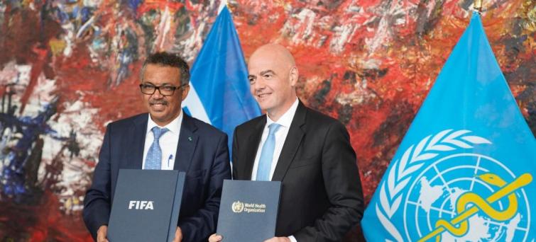 WHO Director-General Dr Tedros Adhanom Ghebreyesus and FIFA President Gianni Infantino sign memorandum of understanding at WHO’s Geneva-based headquarters.