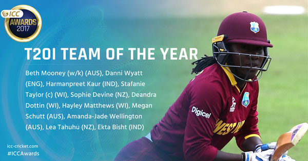 The T20I side is made up of three Australians (Beth Mooney, Megan Schutt, Amanda-Jade Wellington), one from England (Danni Wyatt), two from India (Harmanpreet Kaur and Ekta Bisht), two from New Zealand (Sophie Devine and Lea Tahuhu) and three from the Windies (Stafanie Taylor, Deandra Dottin and Hayley Matthews).