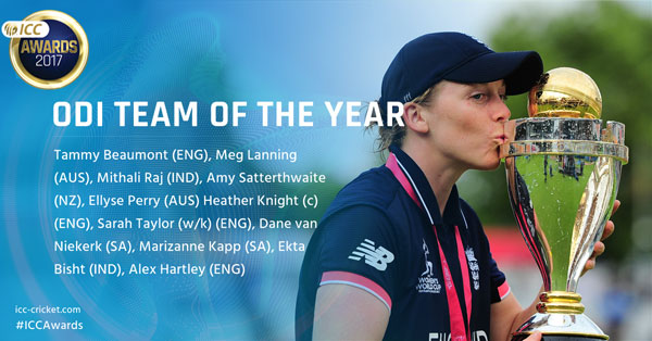 The ODI side comprises players from five countries, including two Australians (Meg Lanning and Ellyse Perry), four England players (Tammy Beaumont, Heather Knight, Sarah Taylor and Alex Hartley), two Indians (Mithali Raj and Ekta Bisht), one New Zealander (Amy Satterthwaite) and two South Africans (Dane van Niekerk and Marizanne Kapp).