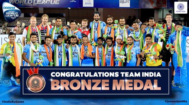 Hockey India tweeted: "The pride on their faces is heartening to see! Congratulations are in order as Team India accepted their Bronze Medals at the Odisha Men's #HWL2017 Final in Bhubaneswar on 10th December 2017. "