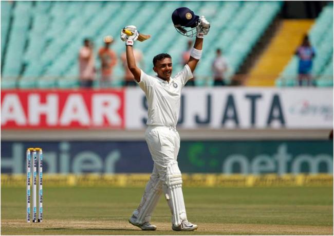 Prithvi Shaw celebrates his century. Source: Indian Cricket Team via Facebook.