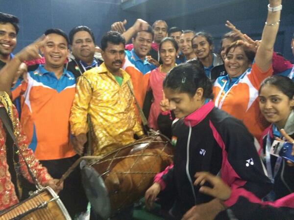 " Celebrations after Team India reached the semi finals of the Uber Cup for the first time ever!" Nehwal tweeted.