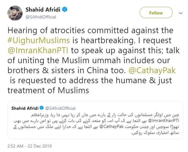 Shahid Afridi recently tweeted and urged country's Prime Minister Imran Khan to “speak up” for Uyghur Muslims in China and requested the Chinese government to give “humane” and “just” treatment to Muslims.