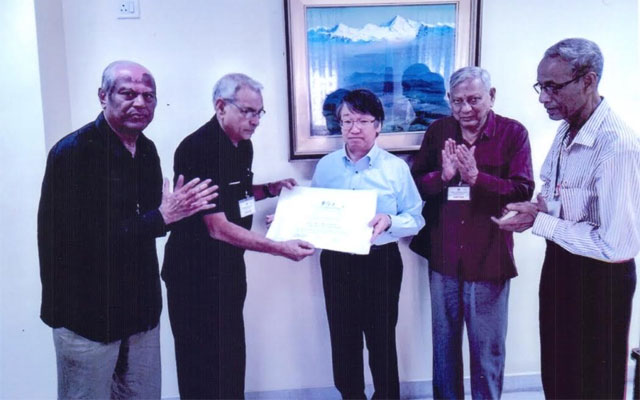 Jibananda ,accompanied by other members of Indo-Japan Association Kolkata including acting vice president Dr. Sudhir Kumar Ghos, Secretary Nabinananda Ghosh and assistant secretary Ajit Kumar Ghosh felicitated Taga at a brief function held in Japanese Consulate here .