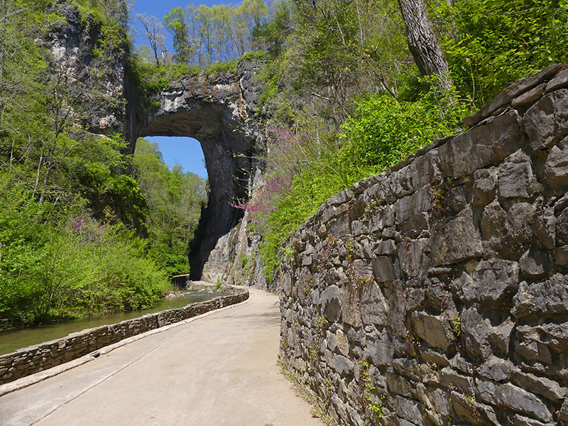 As you wind up your day, don't miss a stop at one of Virginia's most famous landmarks, the majestic Natural Bridge State Park. Natural Bridge was listed on the National Register of Historic Places as a National Historic Landmark in 1988 and in 2016 became Virginia's 37th state park. The spectacular 215-foot-tall Natural Bridge consists of horizontal limestone strata and is the remains of the roof of a cave or tunnel through which the Cedar Creek once flowed. In addition to the stunning bridge, this state park features seven miles of hiking trails, including Cedar Creek Trail which leads visitors under the bridge to the Monacan Indian Village, and Lace Falls with its 30-foot cascade. The park also recently became Virginia's fifth official Dark Sky Park - making it not only a great place to spend the day, but also the night! Let's discover more of the park.