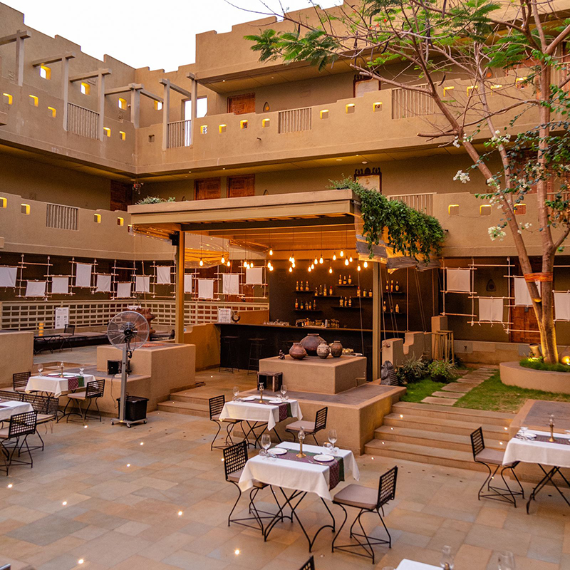 Amenities in the resort include a rooftop pool (Hauda), banquet and event spaces (Dholavira), workout terrace (Chhajja), cafe, bar & fine dining (The Great Bath Cafe), curio shop (Pitara), spa (Ayur), etc.