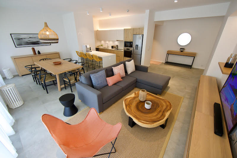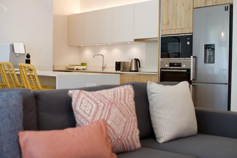 You can choose between a studio, a one or two-bedroom apartment or a penthouse with two suites. So as I stepped inside the apartment, it was like: wow, this is home. This fully furnished apartment with pastel tones and natural materials is spacious, equipped with all the necessary facilities, including a kitchenette which is almost a kitchen. The balcony with each apartment is spacious too.