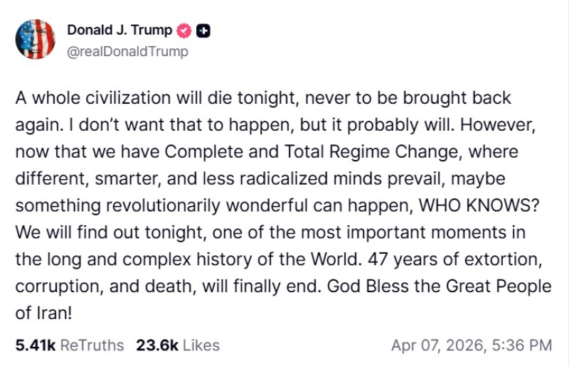 In a post on Truth Social, Trump stated that a catastrophic outcome could unfold by the end of the day, although he added that such a scenario might still be avoided.