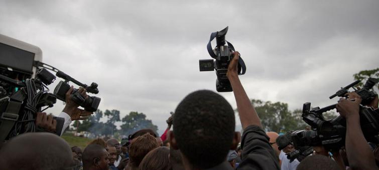 A crowd of journalists in Maluku transit camp, on the outskirts of Kinshasa, the capital of the Democratic Republic of the Congo, where citizens of that country, deported from Brazzaville, Republic of the Congo, have gathered. (23 May 2014).