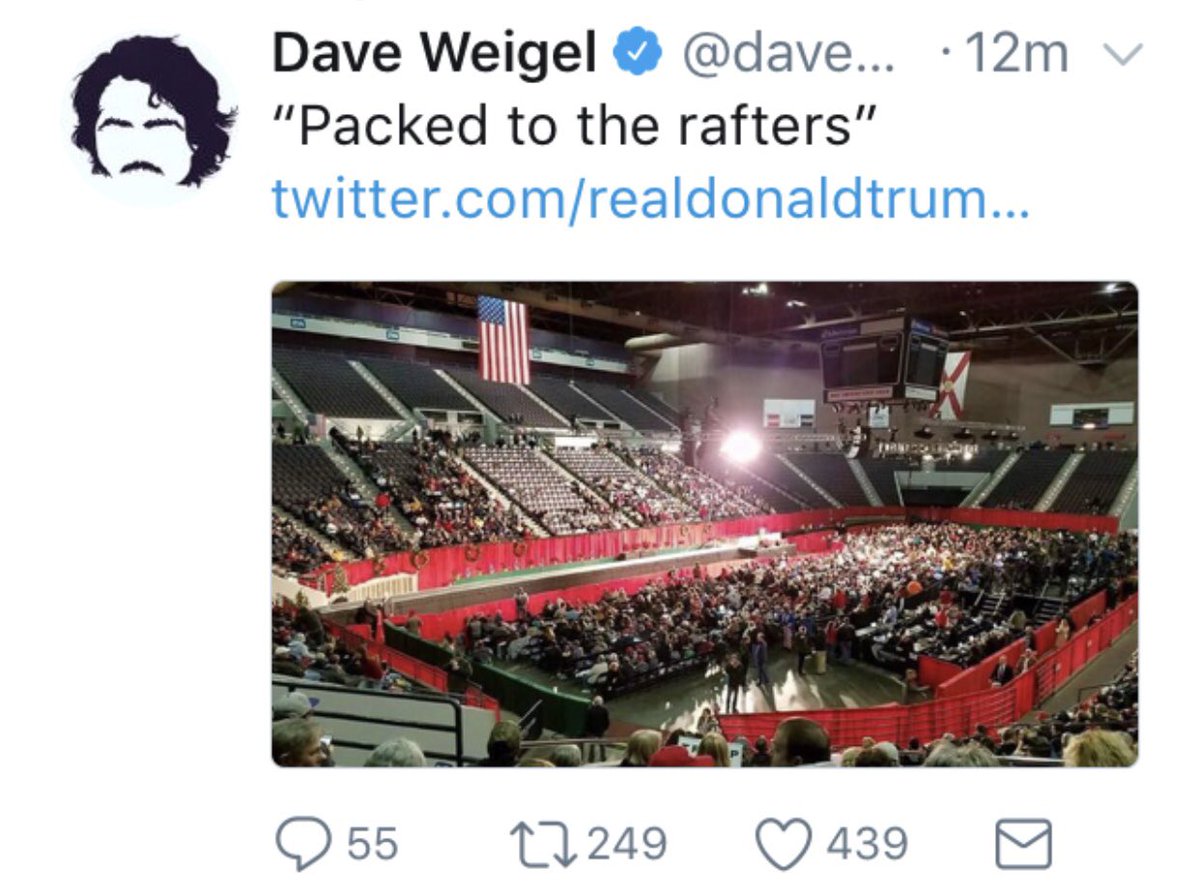 He followed it up with another tweet, saying, ".@daveweigel of the Washington Post just admitted that his picture was a FAKE (fraud?) showing an almost empty arena last night for my speech in Pensacola when, in fact, he knew the arena was packed (as shown also on T.V.). FAKE NEWS, he should be fired."