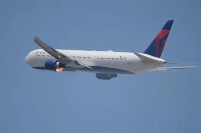 In the video, Flight DL446, operated by a Boeing 767-400, could be seen airborne with flames coming from the aircraft's left engine.