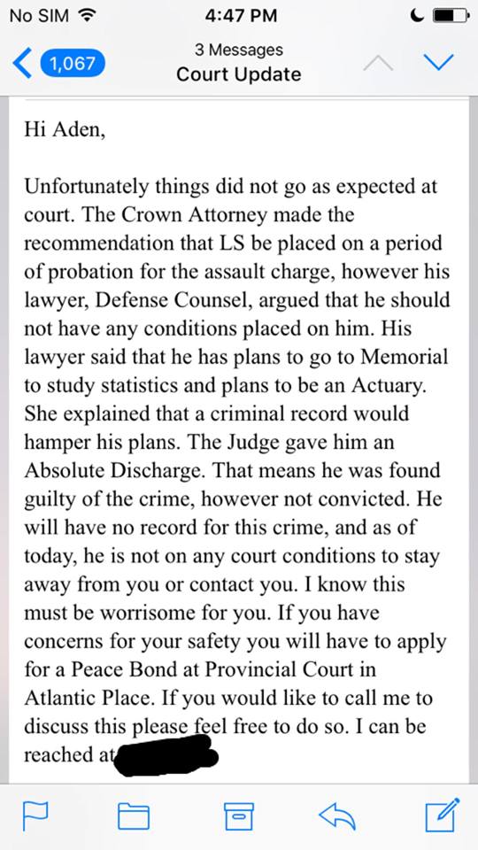"Yesterday it was decided that yes he was guilty but is not going to be punished for anything because it would "hamper his plans" for the future; this being after the fact that the crown attorney had told me that he had took the plea deal to be on probation . 24 hours later and I still can't believe this is how our justice system works or how this even happened. It's 2017 this shouldn't still be happening" she added.