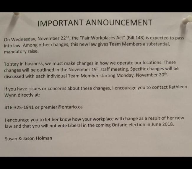 Even the owners told employees to convey Wynne that they will not vote for the Liberals in the election, to be held in June, 2018, for the minimum wage hike that led to their ordeal.