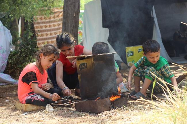 The shelter is run by one of our partners, the Syrian Arab Red Crescent Society. Dozens of families live in a three-storey apartment block, two families share one room. The few belongings they could take when they fled are piled neatly along the wall. I see a lonely doll sticking out of a bag. No food in the corner used as a kitchen, just cooking utensils.