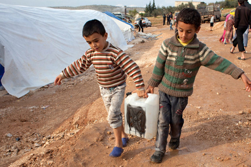 Two young boys carry water at Qah, a makeshift camp for displaced people in northern Syria, near the Turkish border. The people here receive limited and irregular amounts of humanitarian aid. Photo: Jodi Hilton/IRIN