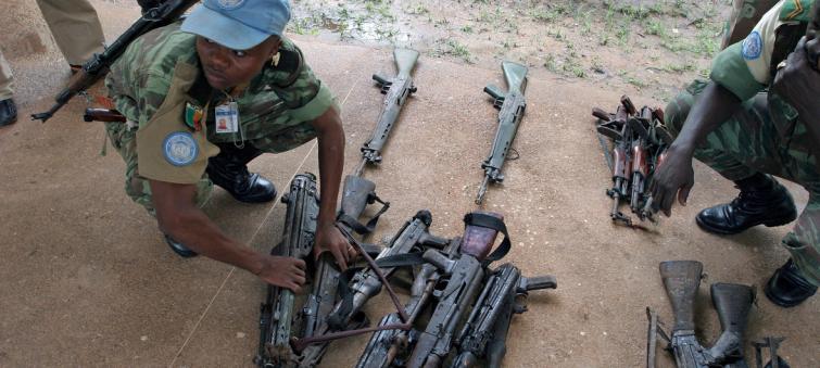 A UN peacekeeper with firearms collected from militias in Côte d'Ivoire.