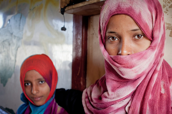 Two displaced girls stand in front of the classroom where their family has been living in Aden, Yemen. Photo: UNHCR/P. Rubio Larrauri