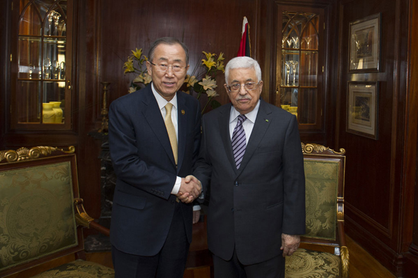 UN Secretary-General Ban Ki-moon and Palestinian President Mahmoud Abbas at International Gaza Reconstruction Conference, Cairo, Egypt. 12 October 2014. UN Photo/Eskinder Debebe