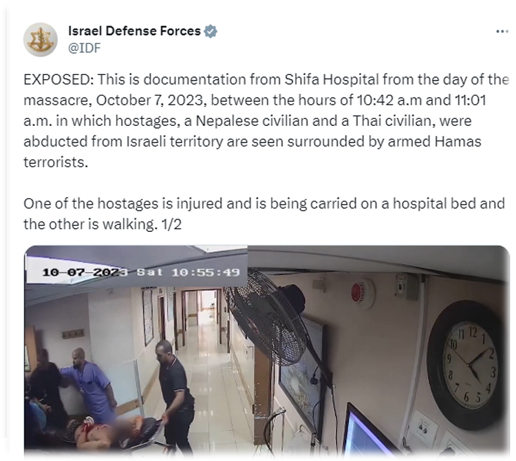 Sharing video footage, IDF wrote on its X page: "EXPOSED: This is documentation from Shifa Hospital from the day of the massacre, October 7, 2023, between the hours of 10:42 a.m and 11:01 a.m. in which hostages, a Nepalese civilian and a Thai civilian, were abducted from Israeli territory are seen surrounded by armed Hamas terrorists."