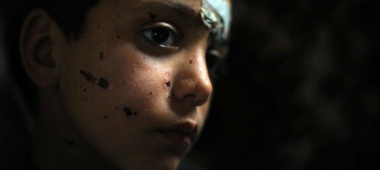 Traveling with his family via an unofficial border crossing from Syria to Lebanon, the nine-year-old boy pictured here was injured during an unidentified explosion; abrasions from the explosion are also visible on his face.