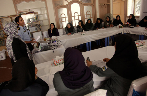 Women police in Herat, Afghanistan, boost their literacy through UNAMA’s Ustad Mobile programme. Photo: UNAMA