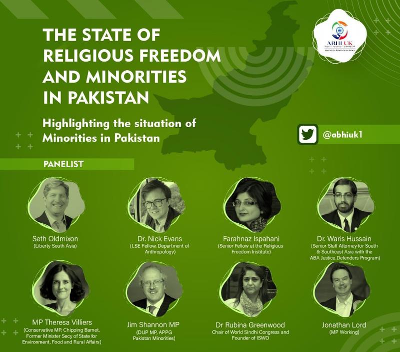 The webinar on “The State of Religious Freedom and Minorities in Pakistan” was held recently. The speakers at the event were Theresa Villers, Chipping Barnet, Farahnaz Ispahani, Senior Fellow at the Religious Freedom Institute; Dr. Waris Hussain, Senior Staff Attorney for South and Southeast Asia with the ABA Justice Defenders Program; Dr. Rubina Greenwood, Chair of World Sindhi Congress; and Jonathan Lord, MP Working.